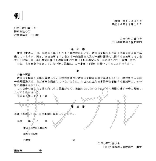 (1)「届出書」を提出します: 会社を継続させたいときは,通知書の下部にある「届出書」に必要事項を記載の上,会社実印を押印して管轄法務局に提出・郵送します。司法書士が代行することもできます。
